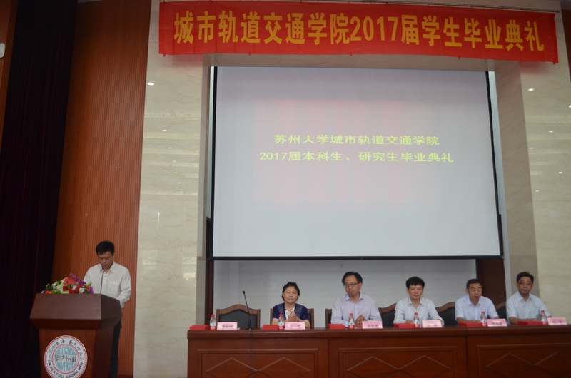 岁月流逝挥不去执着的梦,时光飞驰带不走永恒的心。2017年6月29日上午9点,苏州大学城市轨道交通学院2017届本科生、研究生毕业典礼在阳澄湖校区图书馆大报告厅举行。出席此次毕业典礼的学院领导和老师有城市轨道交通学院院长朱忠奎老师,院党委书记杨清老师,院党委副书记、副院长黄晓辉老师,副院长肖为周老师,院党委副书记田雷老师,院党委委员、学术委员会主任汪一鸣老师、院总实验室主任陈红仙老师,院信控工程系副主任杨勇老师,院土木工程系副主任曹世杰老师,院交通运输工程系副主任王志强老师,院科研秘书蒋宇老师,院学工办主任、2013级本科生辅导员顾雁飞老师,院团委副书记、2016级本科生辅导员梁畅老师,院2014级本科生辅导员刘仕晨老师。此外,到场的还有2017届毕业生家长代表,以及2017届全体毕业生。此次毕业典礼由黄晓辉老师主持,伴随着庄严肃穆的国歌,毕业典礼正式开始。
